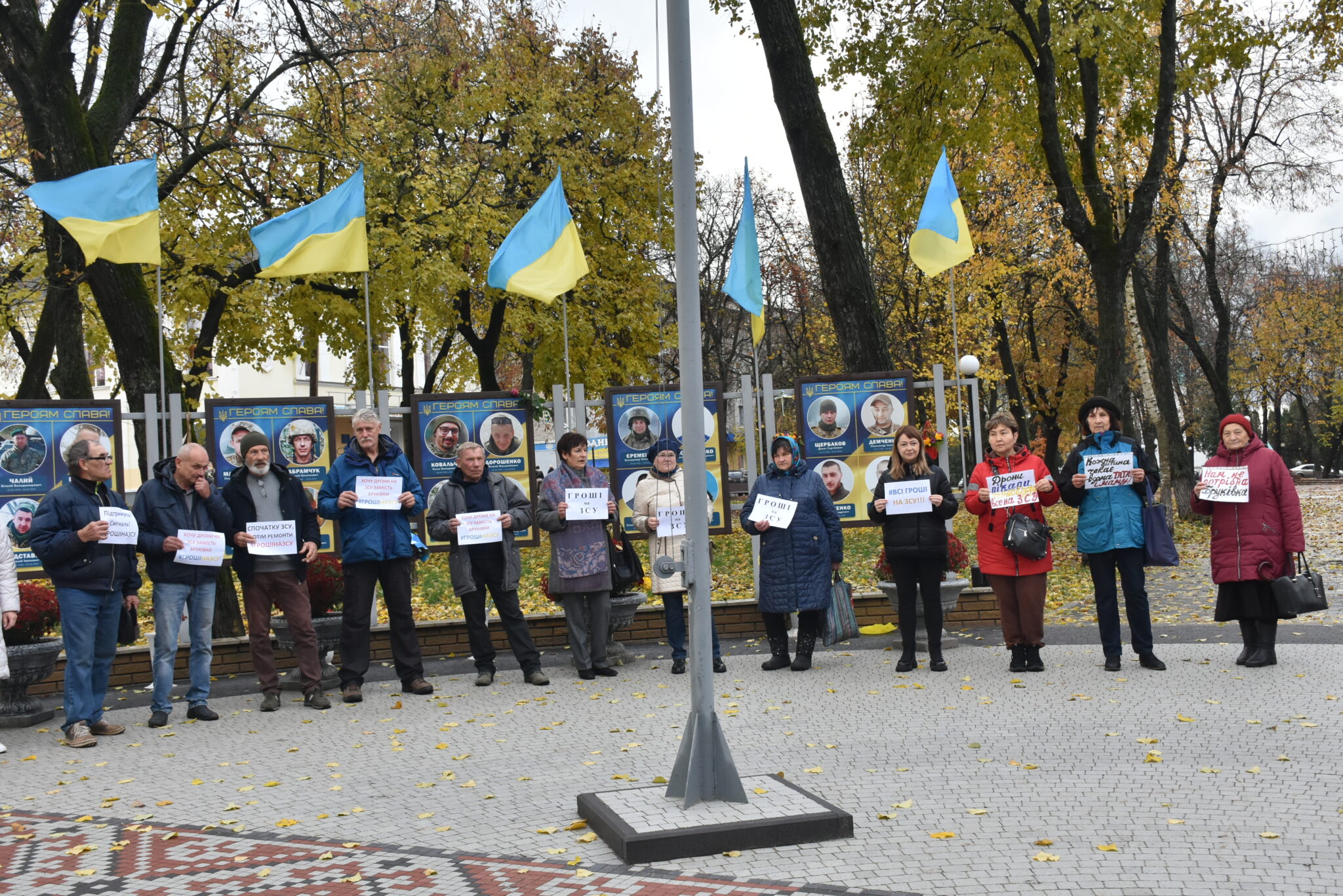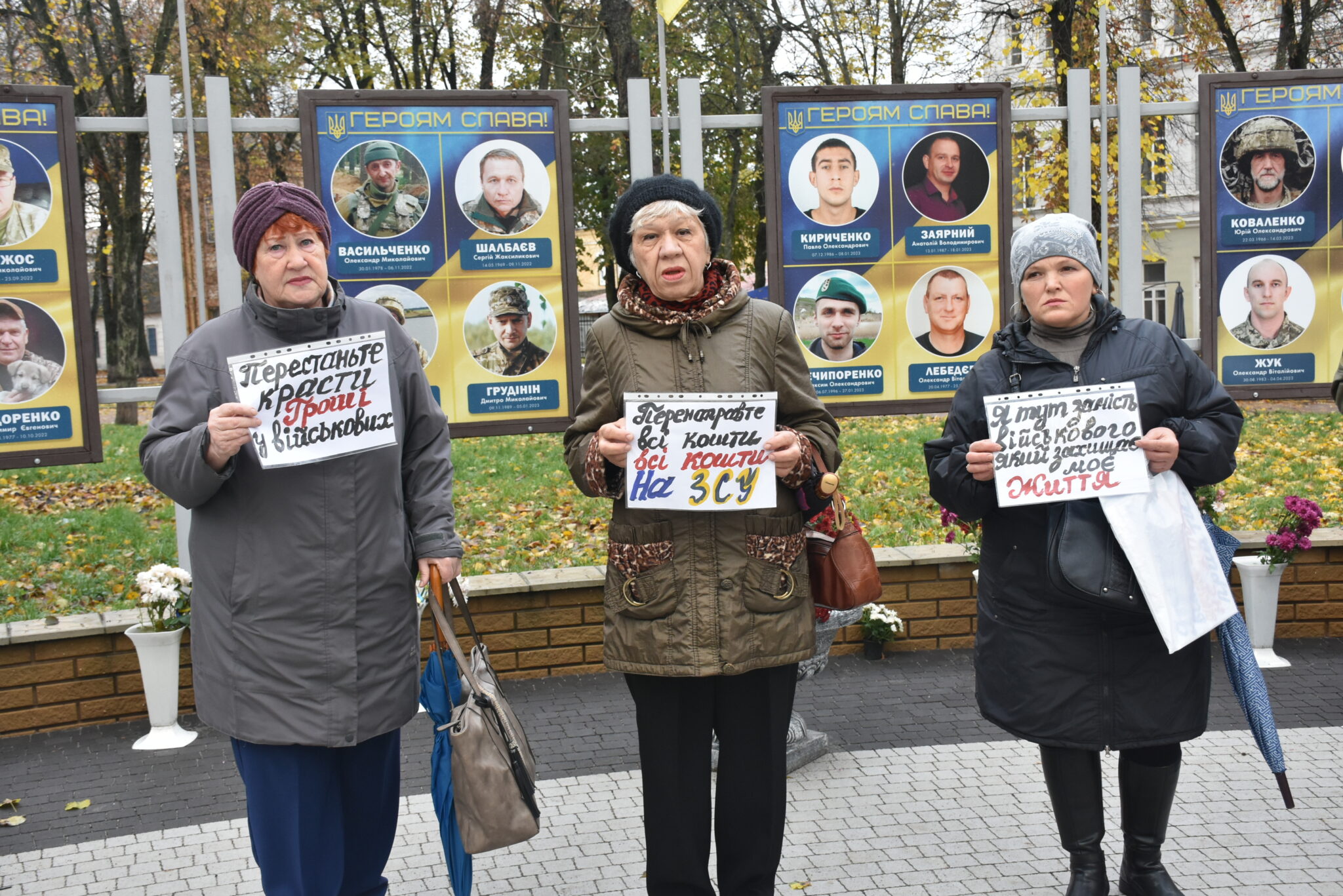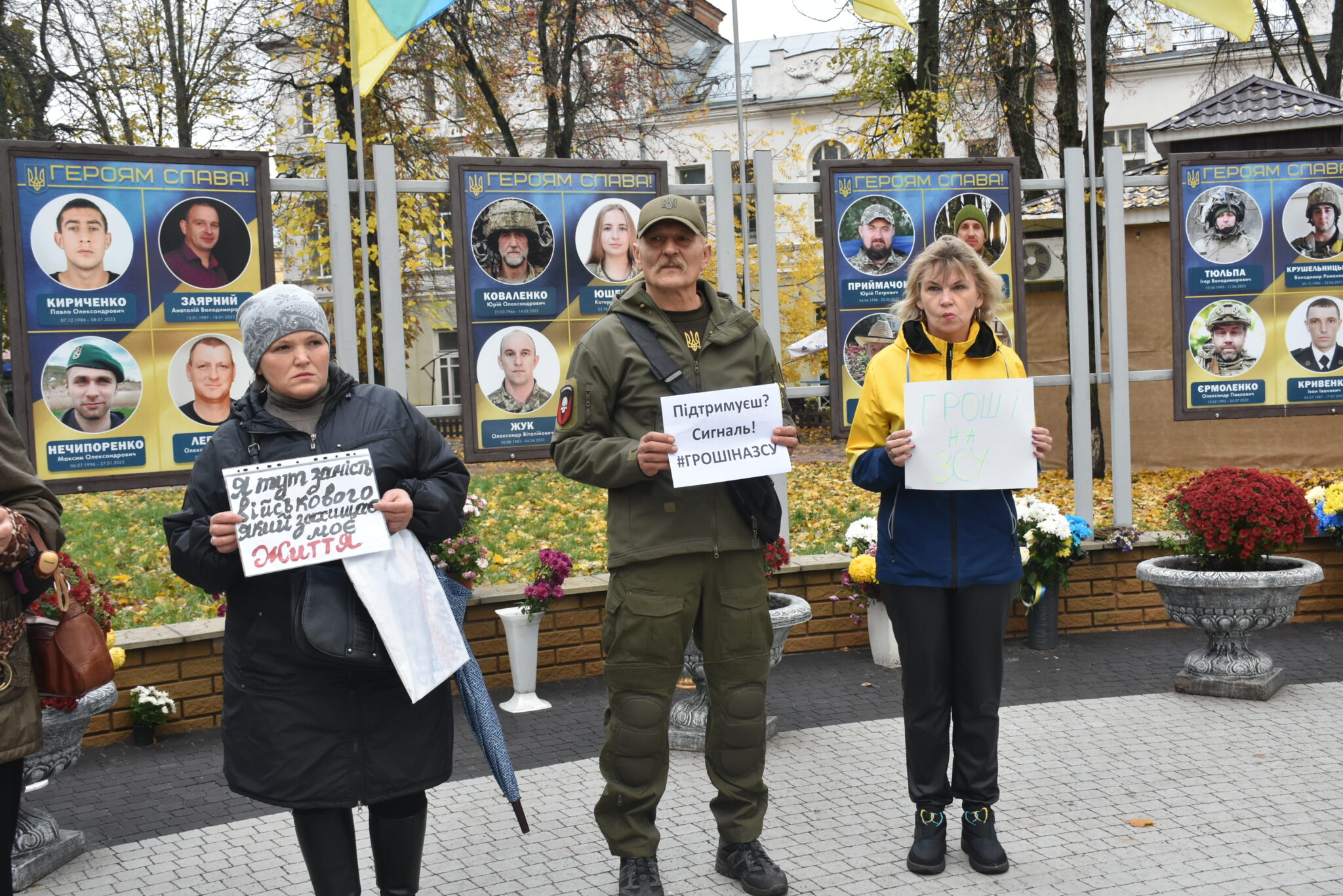 Близько 10:00 небайдужі містяни почали підходити до меморіального місця. Вони стояли вздовж портретів воїнів із плакатами: “Дрони. Пікапи. Тепловізори. Все на ЗСУ”, “Нам не потрібна бруківка”, “Перенаправте всі всі кошти на ЗСУ”, “Підтримуєш сигналь” та інше. Дехто з водіїв, які проїжджали повз, видавали гучні сигнали, висловлюючи солідарність мітингувальникам.