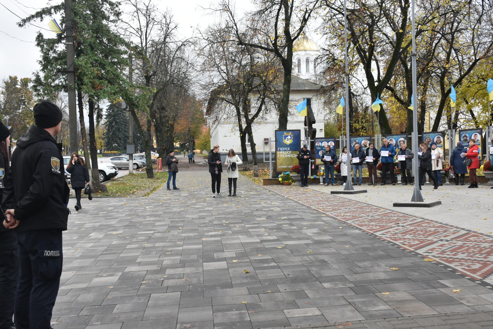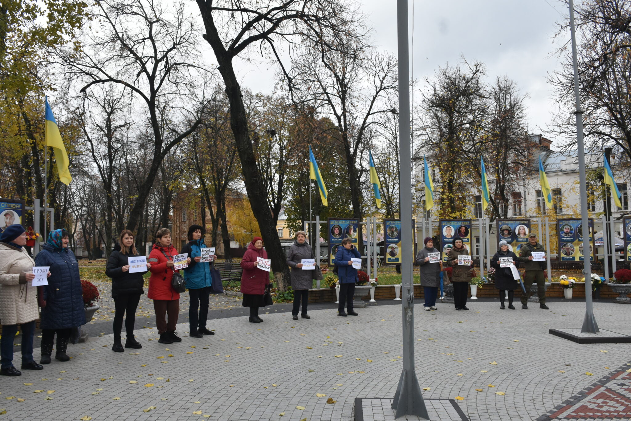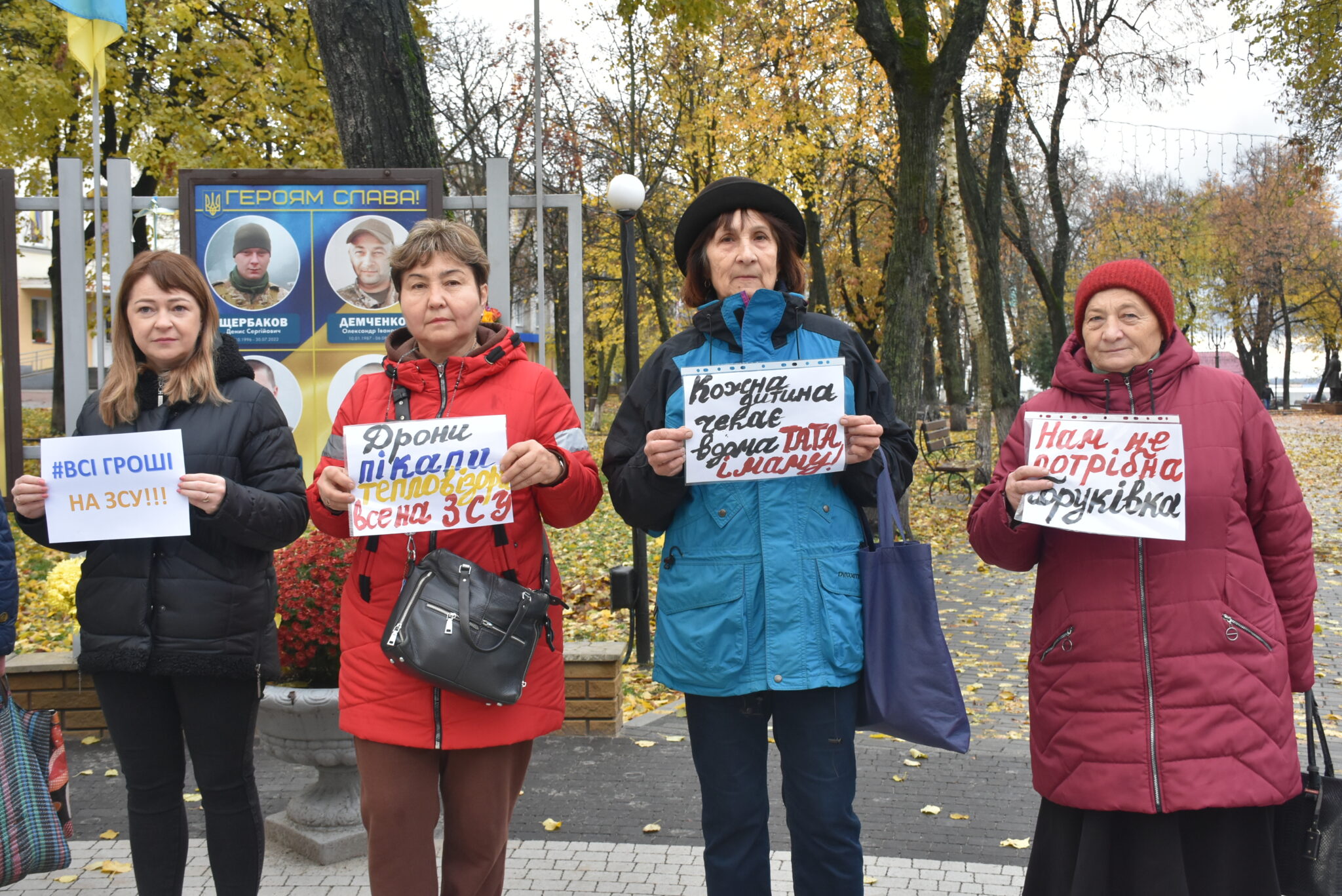 Близько 10:00 небайдужі містяни почали підходити до меморіального місця. Вони стояли вздовж портретів воїнів із плакатами: “Дрони. Пікапи. Тепловізори. Все на ЗСУ”, “Нам не потрібна бруківка”, “Перенаправте всі всі кошти на ЗСУ”, “Підтримуєш сигналь” та інше. Дехто з водіїв, які проїжджали повз, видавали гучні сигнали, висловлюючи солідарність мітингувальникам.
