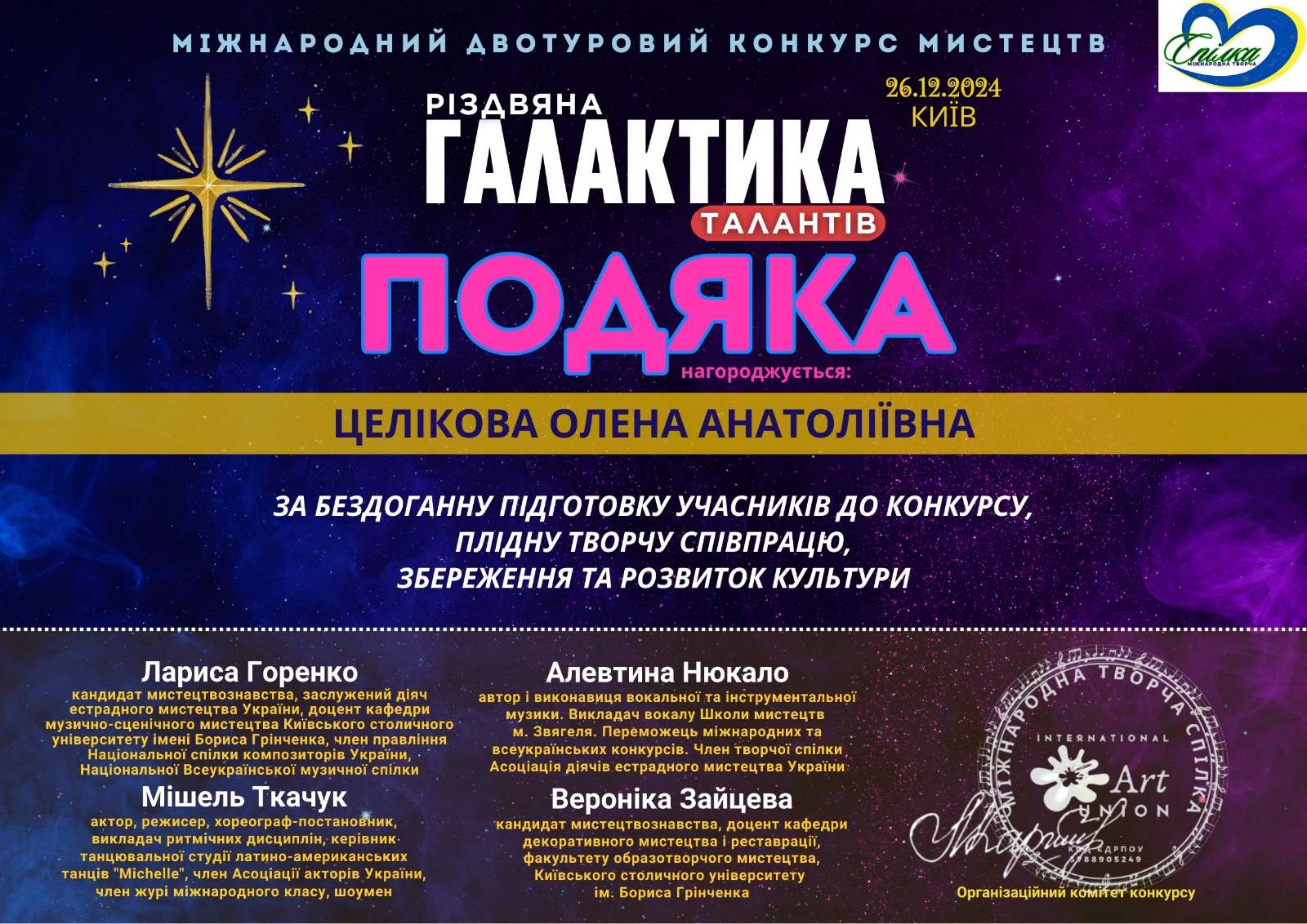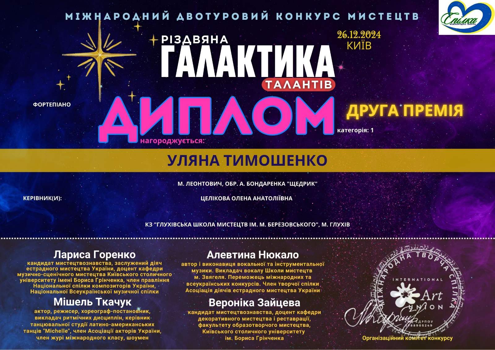 Міжнародний двотуровий конкурс мистецтв “Різдвяна галактика”, який відбувся у м.Київ – лауреат ІІ премії;