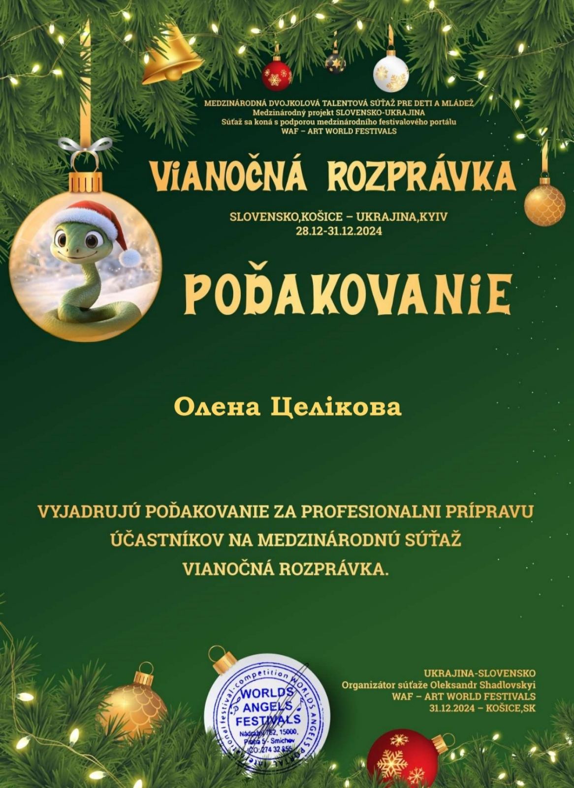 Міжнародний двотуровий благодійний конкурс “Різдвяна казка”, що проходив у Словаччині – лауреат ІІІ премії;