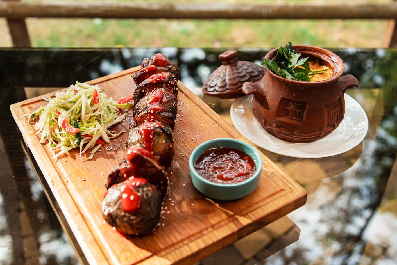 Також на території є ресторан зі звичайним та бенкетним меню. Тож гості комплексу можуть не лише якісно відпочити на природі, а й поласувати смачними та різноманітними стравами.