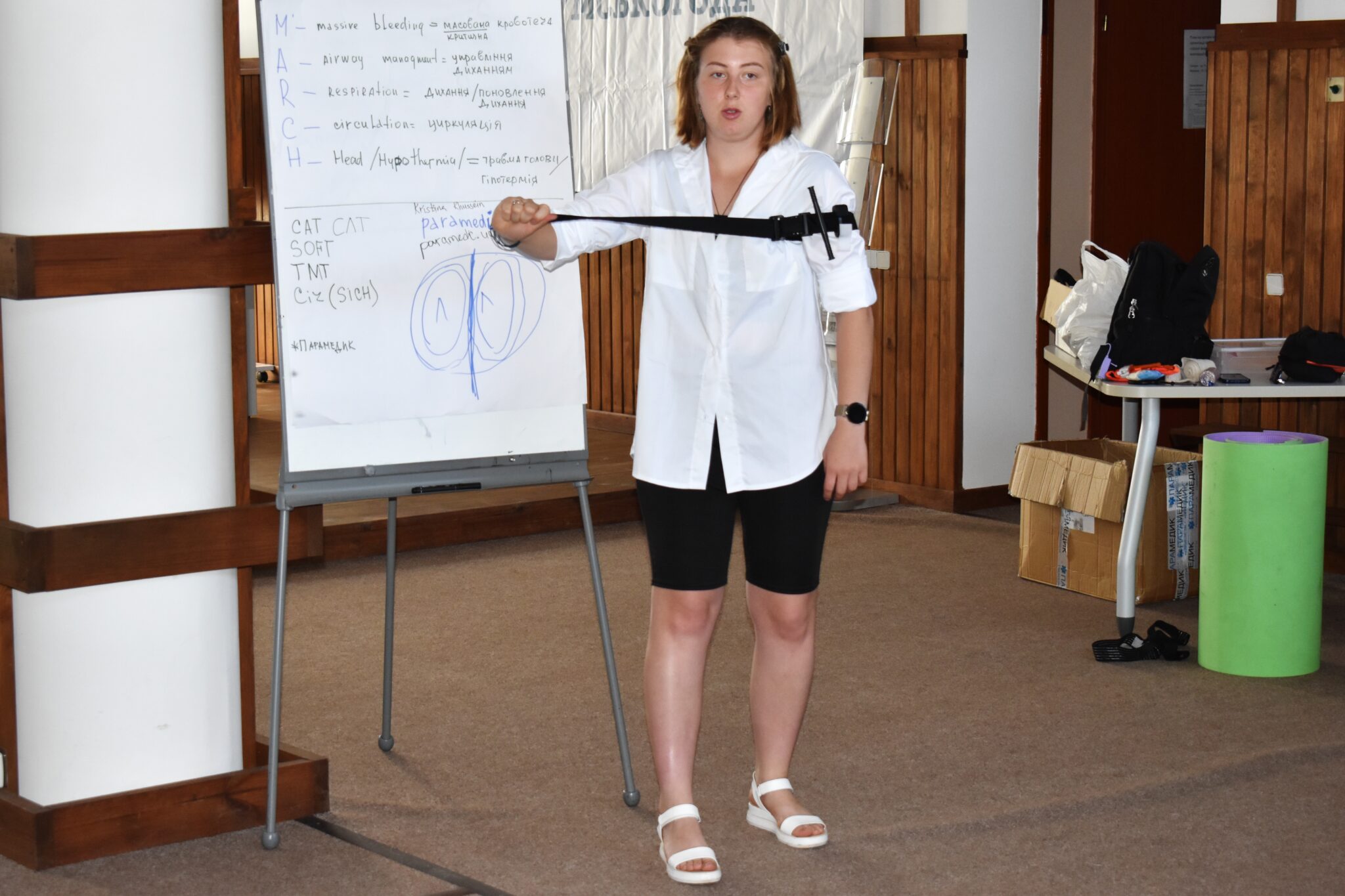 Спочатку потрібно оцінити ситуацію довкола. Не біжіть в охоплений полум’ям будинок, якщо він зруйнований чи пошкоджений частково, подивіться, чи немає загрози обвалу. Пропонуйте допомогу лише тоді, коли самі в безпеці. Якщо людина поранена і необхідно зупинити кровотечу, обов’язково користуйтеся медичними рукавичками, – зауважила методистка КУ СОР “Сумський обласний центр відпочинку, оздоровлення, туризму та військово-патріотичного виховання”, волонтерка Громадського фонду “Суми” Крістіна Хуcсейн.