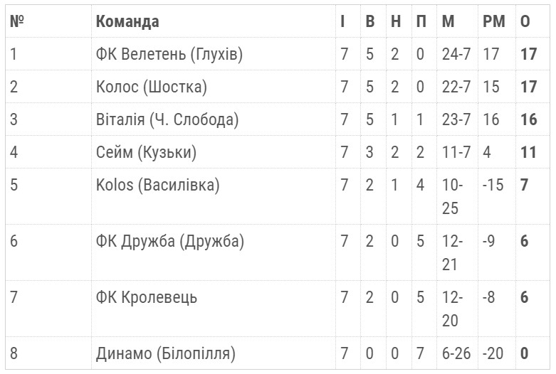 «Велетень» зрівнявся за очками з шосткинським «Колосом». Учора, 23 липня, шосткинці зіграли у нічию з ФК «Віталія» (Конотопський район) – 0:0. Таким чином, тепер у «Колоса» і «Велетня» однакова кількість очок – по 17. За різницею забитих і пропущених м’ячів турнірну таблицю очолила наша команда.