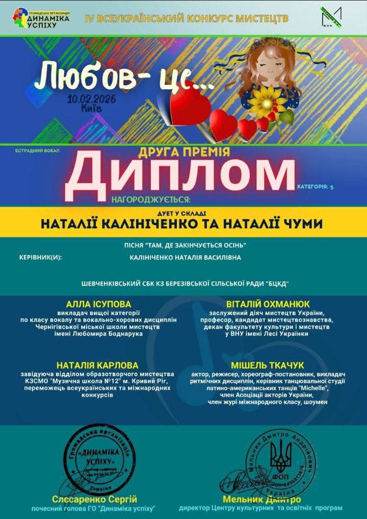 Творчий тандем у складі Наталії Калініченко та Наталії Чуми, які представляли Шевченківський сільський будинок культури (КЗ Березівської сільської ради «БЦКД»), здобув почесне друге місце на IV Всеукраїнському вокальному конкурсі мистецтв під символічною назвою «Любов — це…».