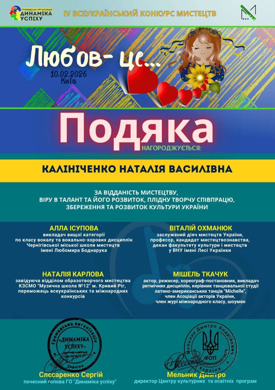 Особливим акцентом конкурсу стала індивідуальна нагорода для наставниці колективу. Наталія Калініченко була відзначена спеціальною подякою від організаторів (ГО «Динаміка успіху») за багаторічну відданість мистецтву, віру в розвиток молодих талантів та невтомну працю задля збереження української культури в нинішні непрості часи. Ця подвійна перемога – і як виконавців, і як педагога – є результатом наполегливих репетицій та незгасного творчого пошуку.