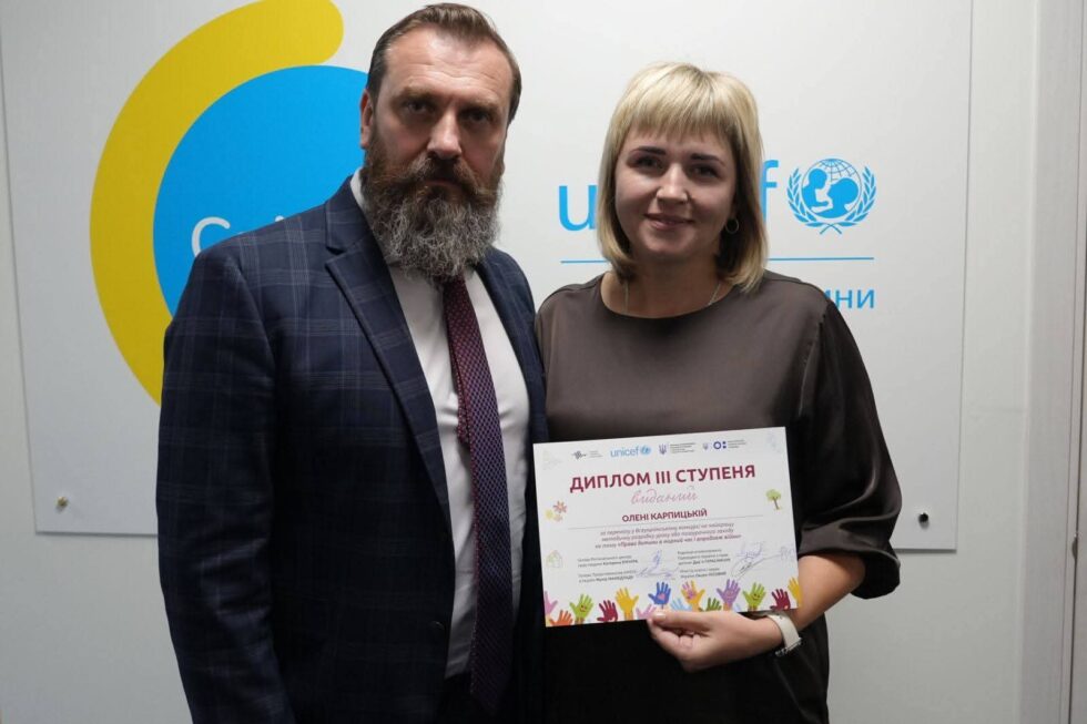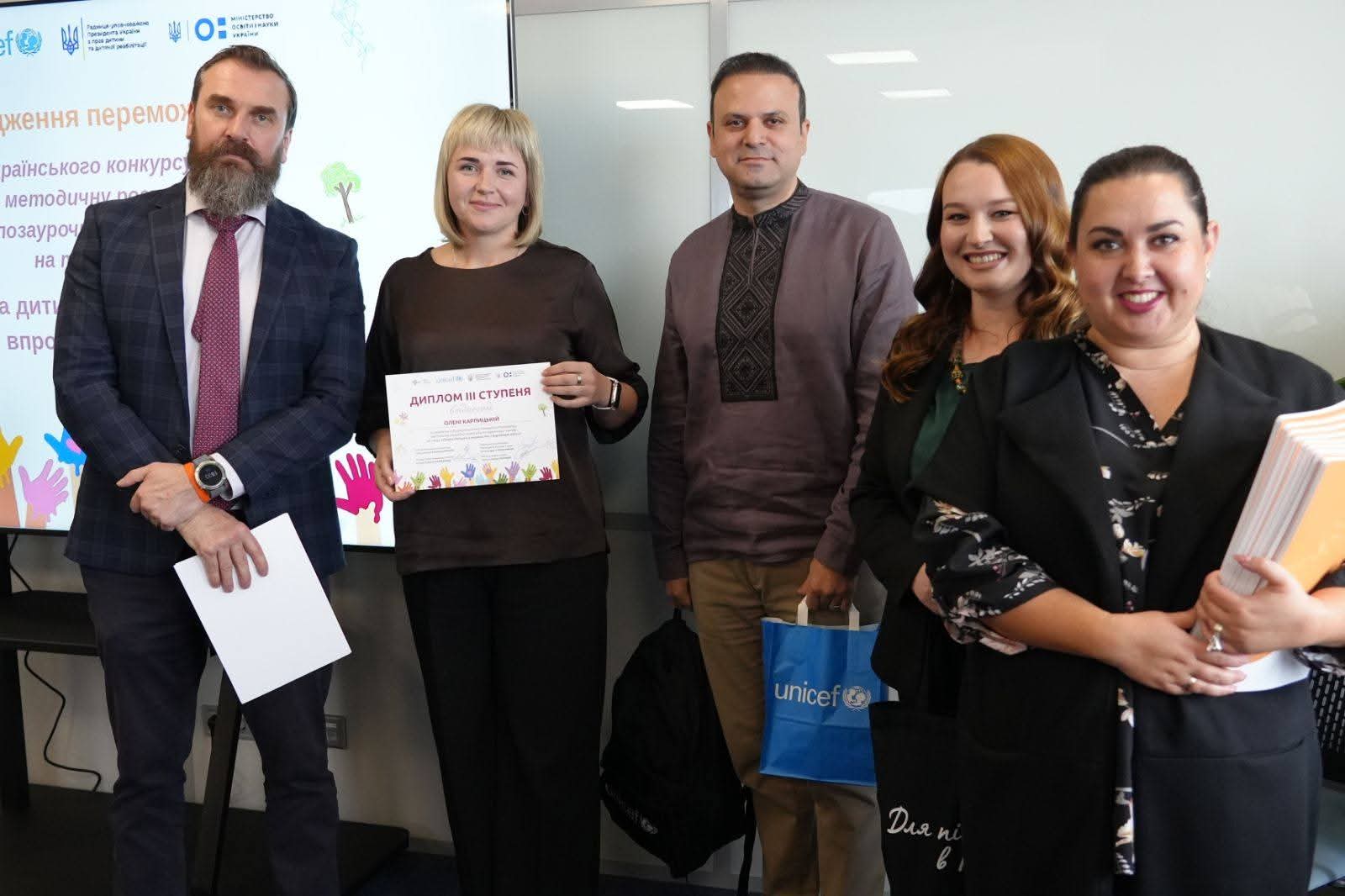 За свою творчу й змістовну роботу Олена Вікторівна отримала нагороду з рук Міністра освіти і науки України Оксена Лісового, а також пам’ятні подарунки від Голови Регіонального центру прав людини Катерини Ємчури та Голови Представництва UNICEF в Україні Муніра Мамедзаде.