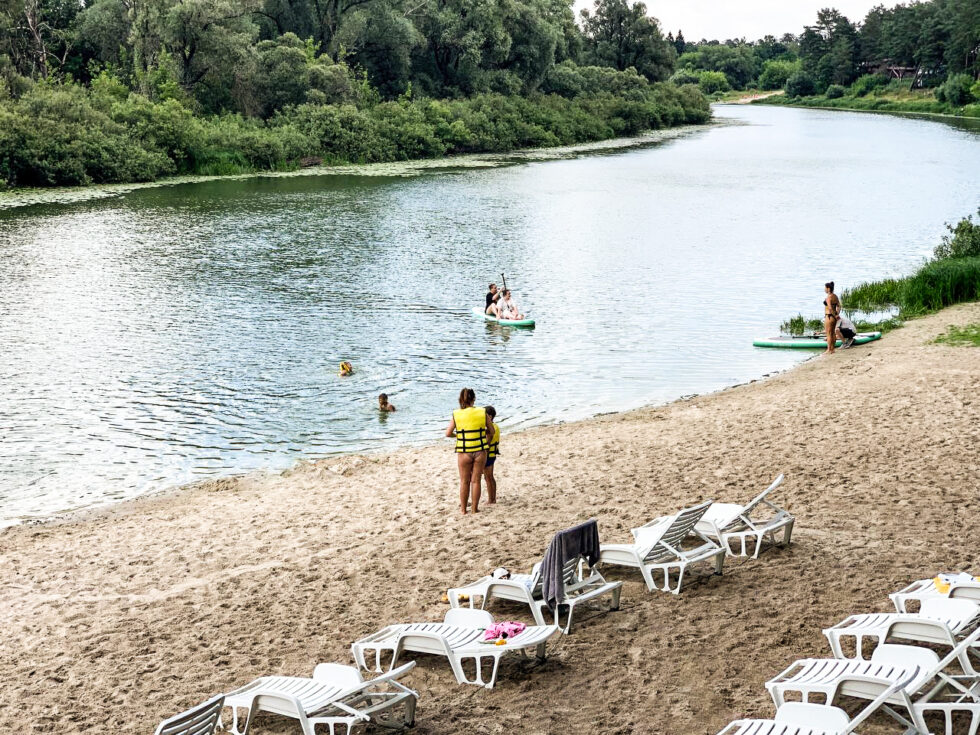 На території комплексу є річка Десна, де можна купатися або просто відпочити на березі. Тут облаштували піщаний пляж, є достатньо лежаків, якими гості, що проживають у будиночках можуть користуватися безкоштовно. Завдяки пологому входу у воду цю локацію часто обирають сімʼї з дітьми.