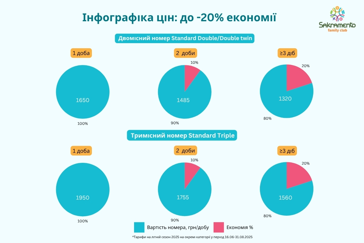 У Sakramento family club діє спеціальна літня пропозиція: бронюючи проживання на 2–3 доби або більше, ви заощаджуєте до 10-20% вартості.