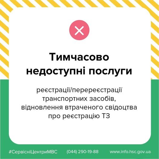 Тому тимчасово призупинено надання послуг з реєстрації/перереєстрації транспортних засобів та відновлення втраченого свідоцтва про реєстрацію у наступних сервісних центрах МВС: