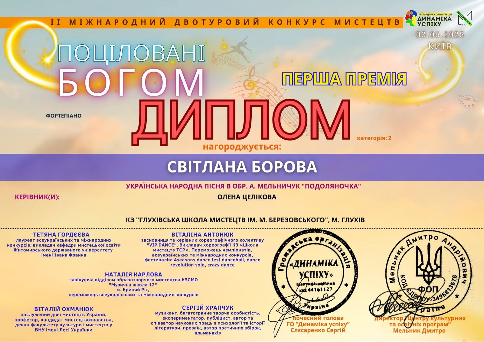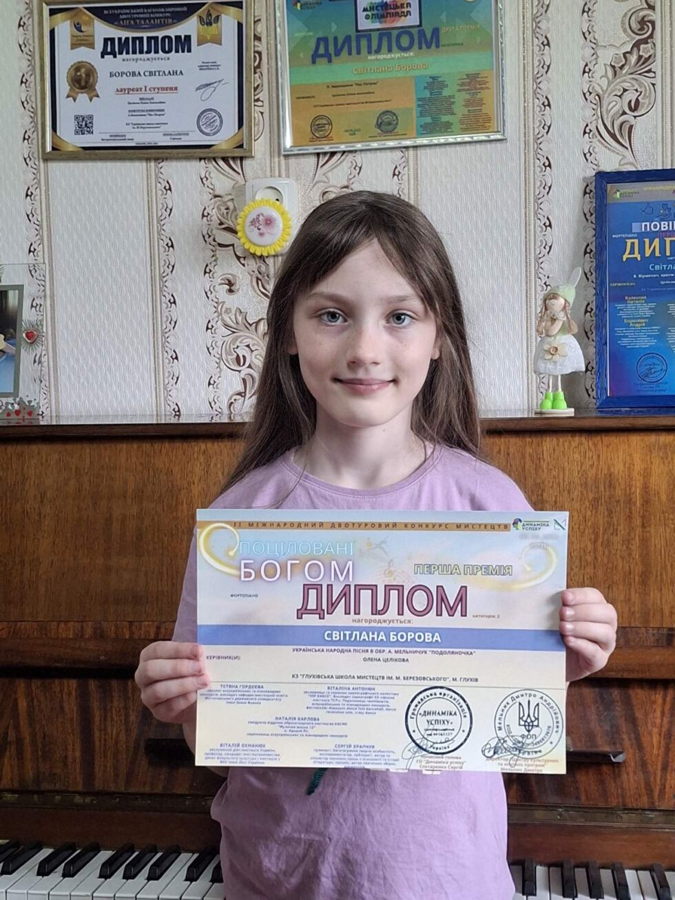 Учениця Глухівської школи мистецтв ім.М.Березовського Світлана Борова здобула перемогу на ІІ Міжнародному конкурсі мистецтв “Поціловані Богом”, який проходив у Києві в дистанційному форматі.
