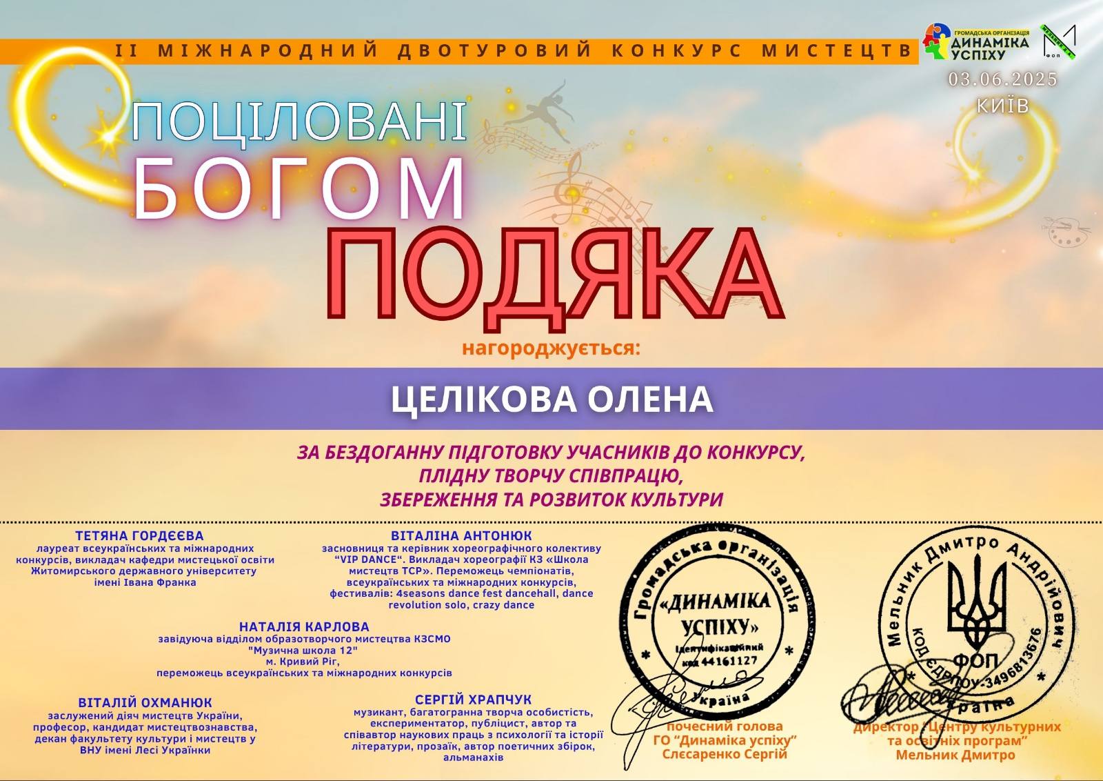 За досягненням стоїть не лише талант, а й наполеглива праця та професійна підтримка викладачки Олени Целікової.