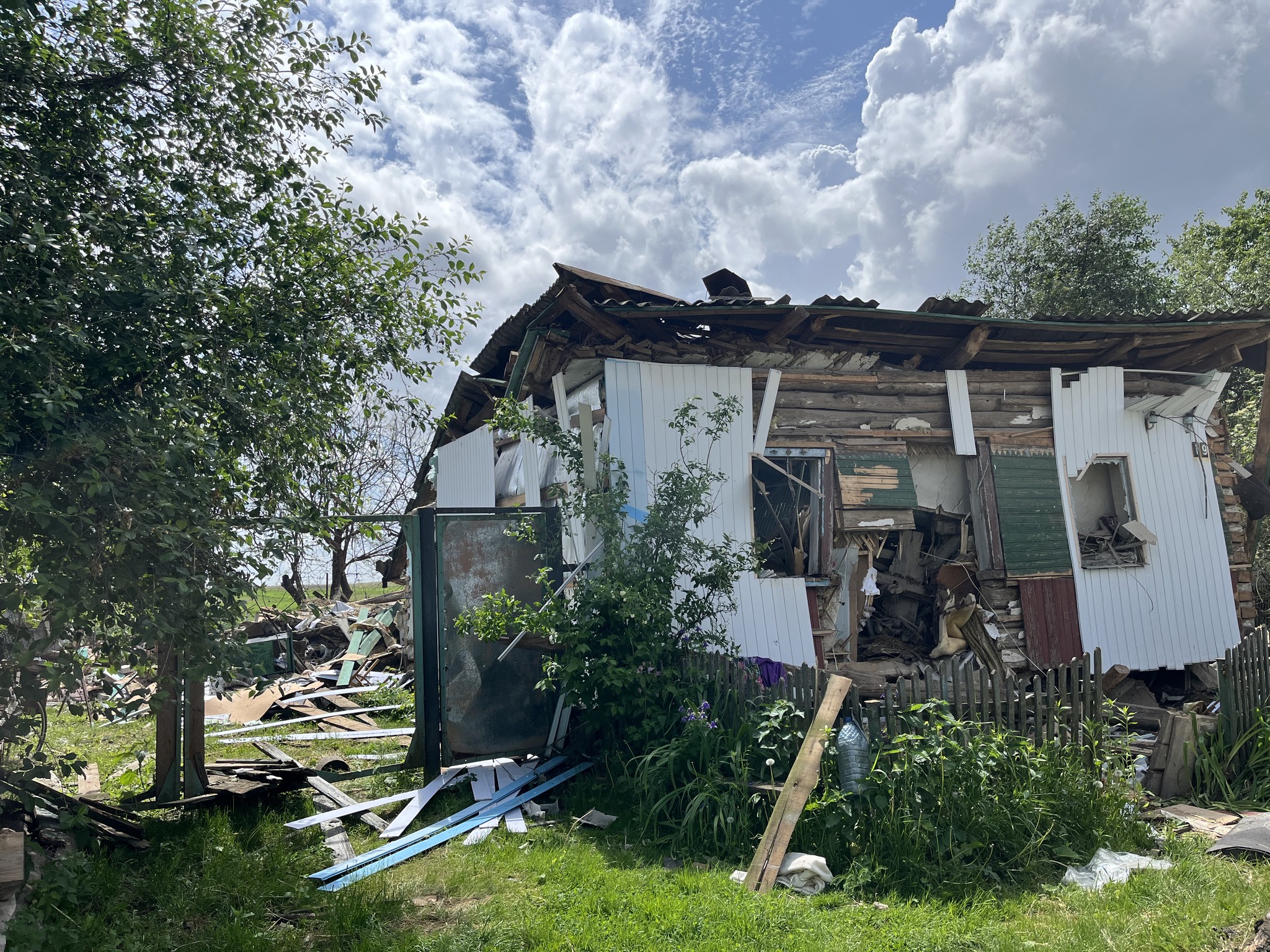 «Я була на городі, поралася, тут чую гудить, летить, вибухає. Я під яблуню заховалася, а воно ще свистить і так гучно вибухає… Наче не було такого раніше. Так і сиділа я під яблунею поки не стихло, а тоді сусіди прибігли підняли мене, лікар миттю приїхав оглянув, каже, у вас все добре, а я й не вірю ще сама, що жива лишилася. Хати майже немає. Сарай до половини завалився. Курочки мої полякані до сусідського забору притулилися й стоять усі гуртом. Кіт і собака до мене притулилися, куди я – туди й вони. Я обійду хату з одного блоку – плачу, гляну з іншого – плачу, і вони за мною слід у слід йдуть, наче бояться, що покину. Нікуди я вже з своєї землі не подінуся, тут буду жити, хай буде, що буде», – ділиться пережитим пані Олена.