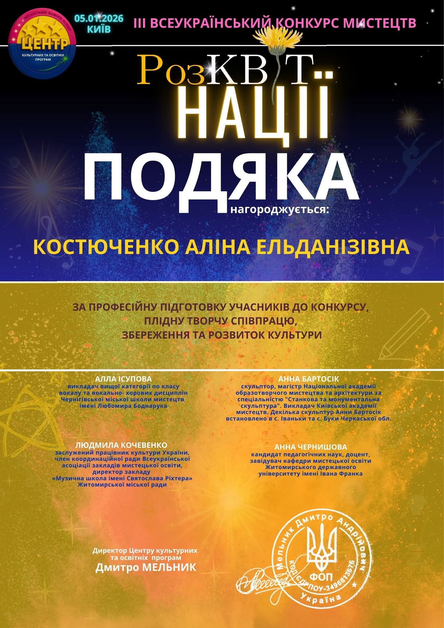 ​За кожною перемогою стоїть титанічна праця педагога. Керівниця колективу, Аліна Ельданізівна Костюченко, була відзначена окремою Подякою від організаторів конкурсу. Журі підкреслило її високий професіоналізм, плідну творчу співпрацю та вагомий внесок у збереження і розвиток української культури серед молоді.