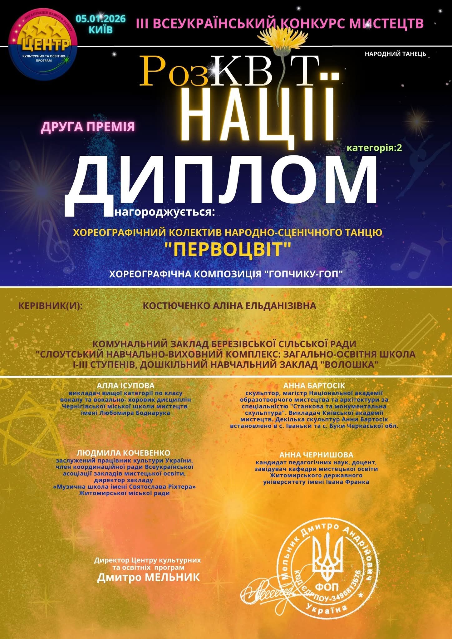 ​Хореографічний колектив народного-сценічного танцю «Первоцвіт» здобув почесне 2-е місце на престижному 3-му Всеукраїнському конкурсі мистецтв «Розквіт Нації».