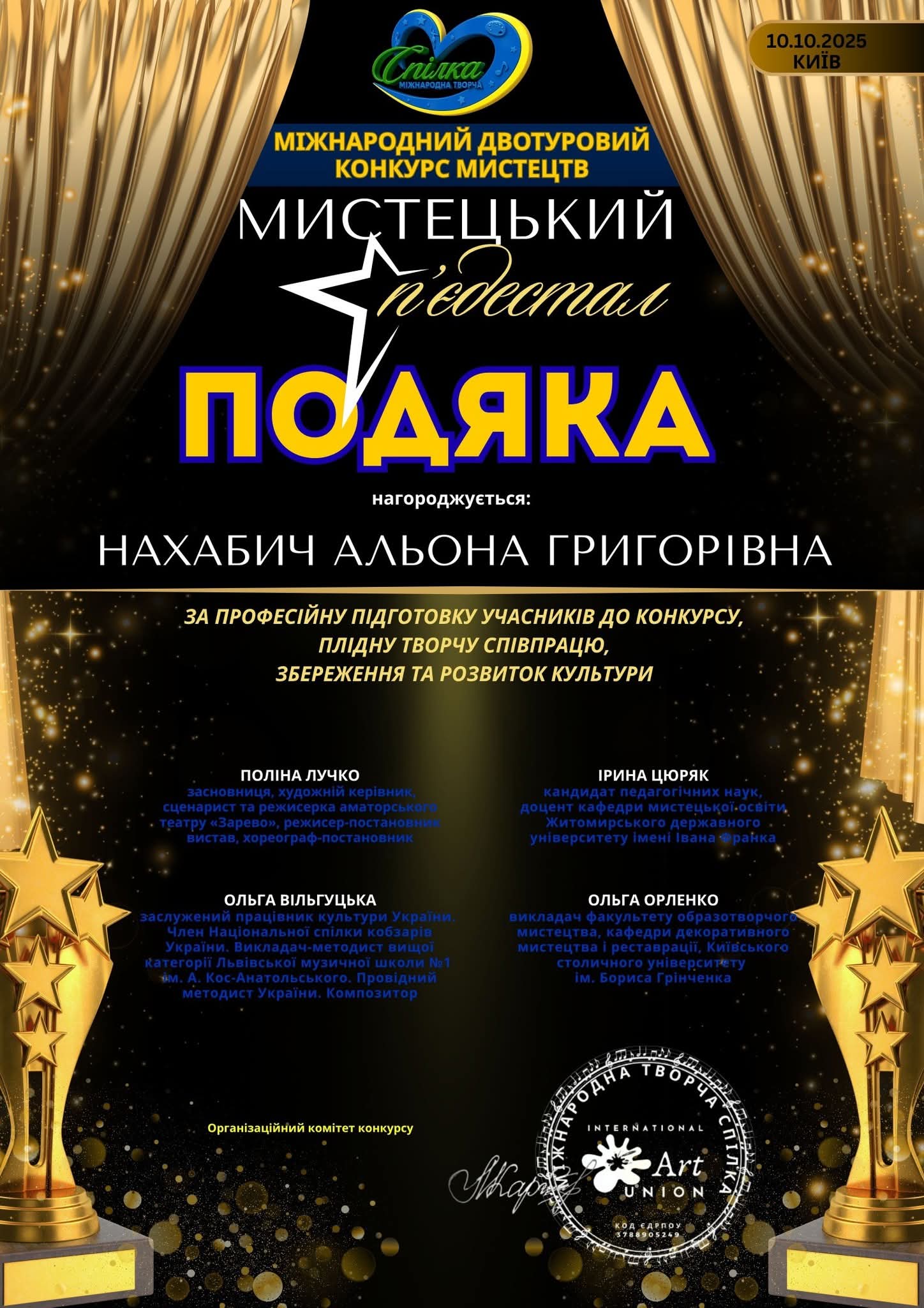 Керівник колективу отримала подяку за професійну підготовку учасників, плідну творчу співпрацю та розвиток культури.