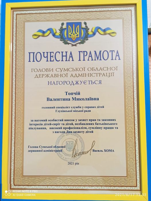 Почесною грамотою голови Сумської обласної державної адміністрації за вагомий особистий внесок у захист прав та законних інтересів дітей сиріт та дітей, позбавлених батьківського піклування, високий професіоналізм, сумлінну працю та з нагоди Дня захисту дітей була нагороджена головний спеціаліст служби у справах дітей Глухівської міської ради Валентина Миколаївна Топчій